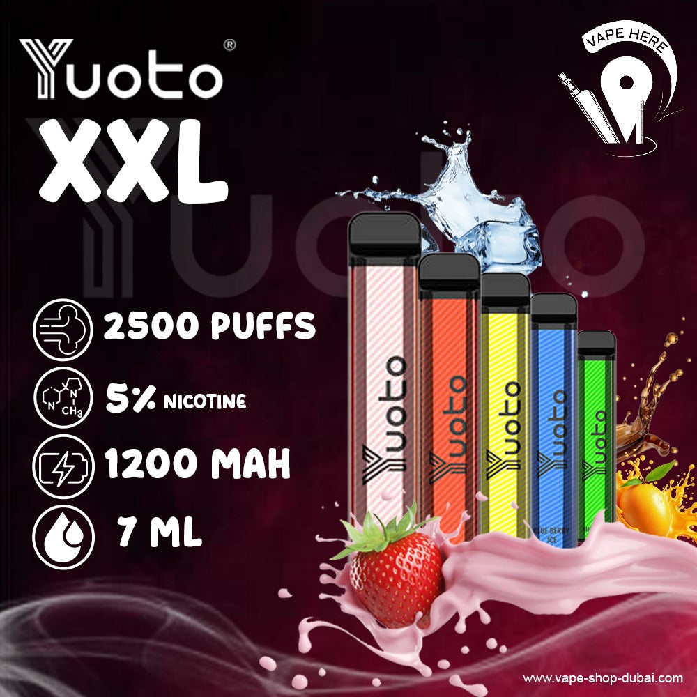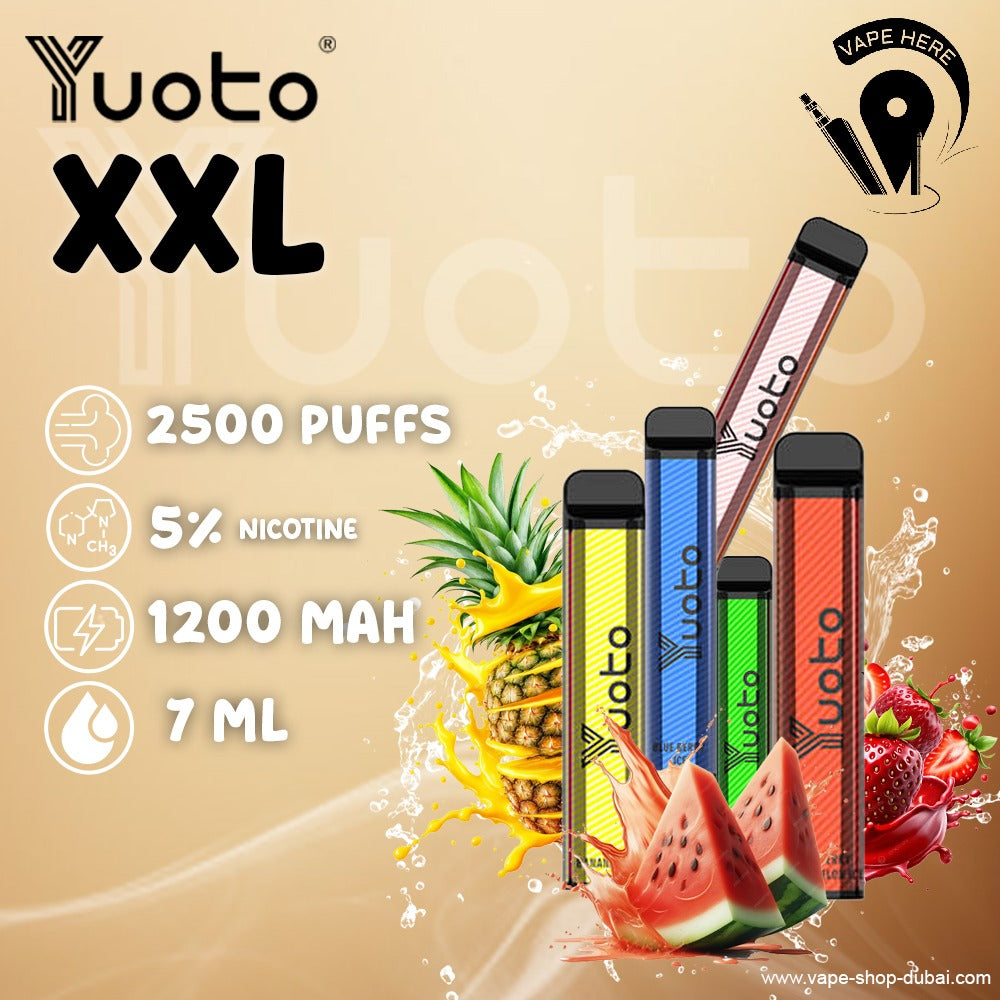Yuoto XXL Disposable is a longer-lasting disposable vape and a great way to enjoy salt nic vaping. It has a cylindrical form factor and a nicely tapered mouthpiece as well. Performance, reliability, and puff count are all greatly improved. Yuoto XXL disposable vape comes with a standard 1200 mAh non-rechargeable battery. It pre-filled a 7.0mL vape juice that has a salt strength of 5%. And offer up to 2500 puffs of long-lasting flavor. Nicotine salts are known to provide a smoother experience for consumers. There is growing popularity in the market for disposables with a larger liquid capacity. Yuoto XXL disposable offers a button-less design and is activated when inhaled. It completely wipes out the task of charging, refilling, and maintaining your mods. Yuoto XXL disposable comes in different flavors to make sure that users do not have to leave their comfort zone or sacrifice the tastes they are accustomed to. Each flavor is extremely different, but there's a flavor for every palette. After every puff, the exotic flavors leave you with a driven head change that enhances your smoking experience.